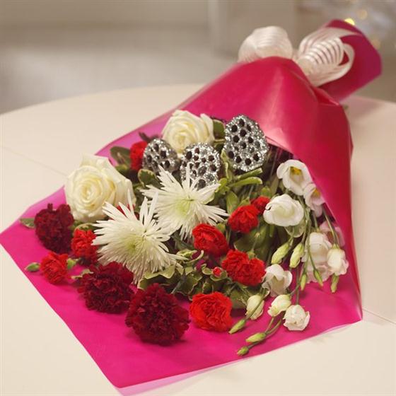 A lovely christmassy selection of red and white flowers, silver picks and seasonal foliages. Please note, wrapping may differ slightly to the one pictured.