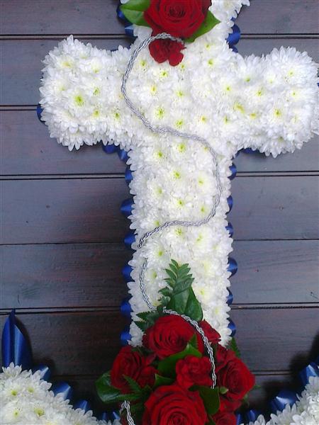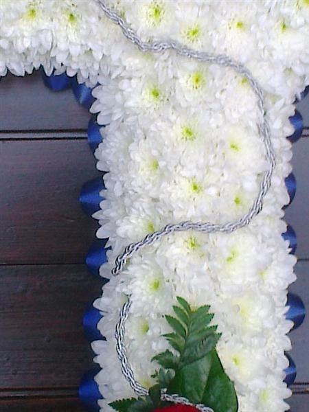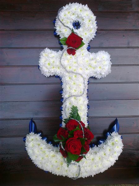 Large based anchor 32"x18" with white chrysanthemum base, blue ribbon edge, and a red rose spray. Anchor size "32 x 18". (Oasis)