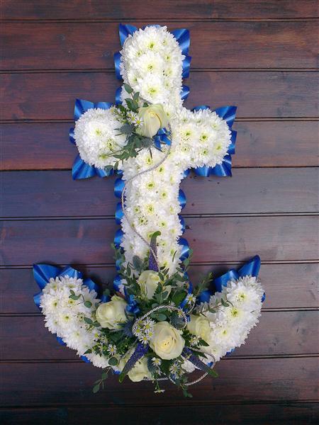 Anchor tribute with white chrysanthemum base, royal blue ribbon edge, and a white rose and foliage spray, size 24"x16". (Oasis)