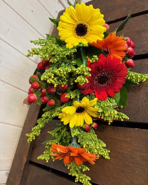 Autumnal Gerberas, Solidago and Hypericum berries with mixed Foliages.