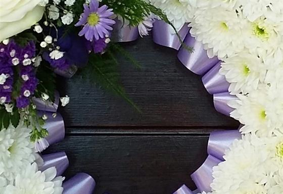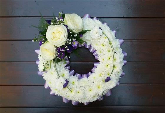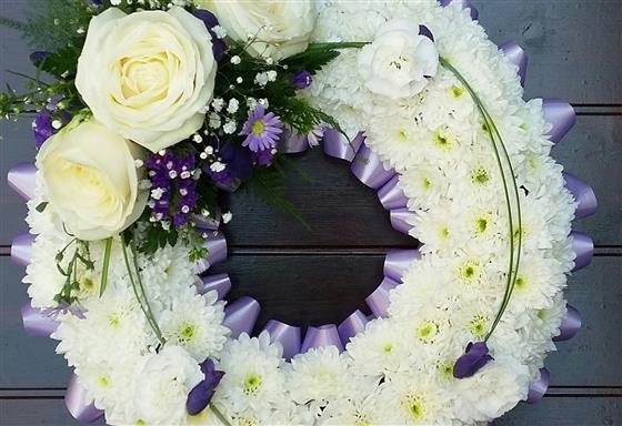 10" based wreath with white chrysanthemums, a lilac ribbon edge and white and purple mixed flower sprays.