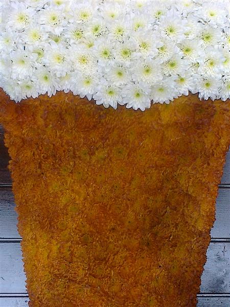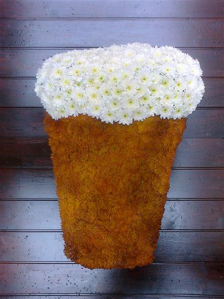 Beer glass funeral tribute, based with chrysanthemums. 44cm x 60cm. Other specialist items are available on request, please call us.