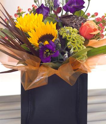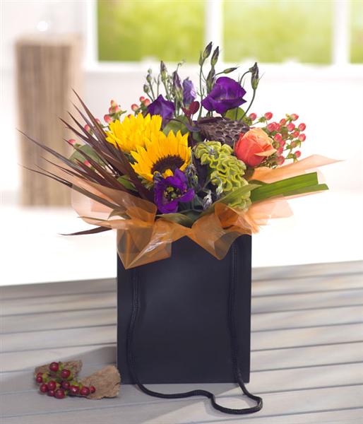 A dramatic selection of mixed flowers in orange, yellow, green and purple handtied in water and delivered in a box. Please note box colour may vary.