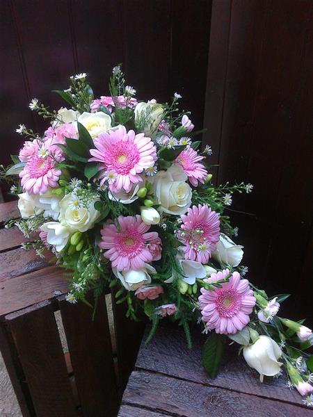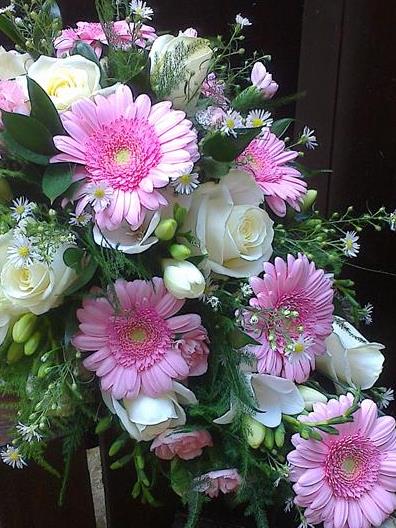 Baby pink germini, avalanche roses, white freesia, september flower with mixed foliages.