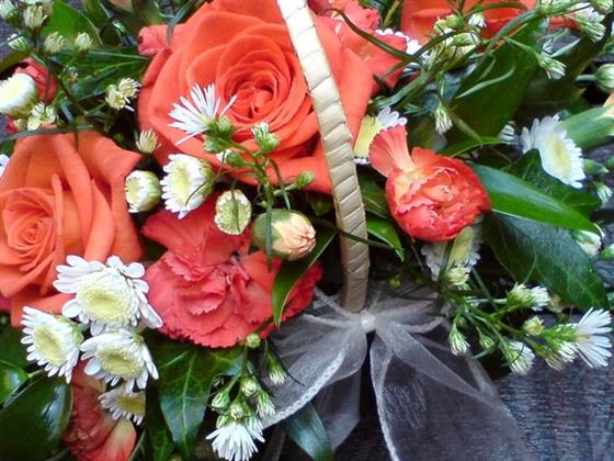 Orange roses, orange spray carnations, stallion & september flower.