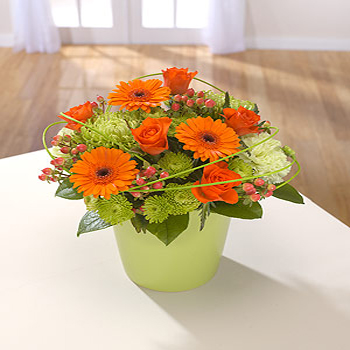 A warm mixture of orange and green flowers arranged in a complimenting container.