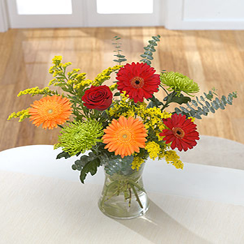 A vibrant selection of Orange, red, yellow and green flowers with mixed foliages in a glass vase.