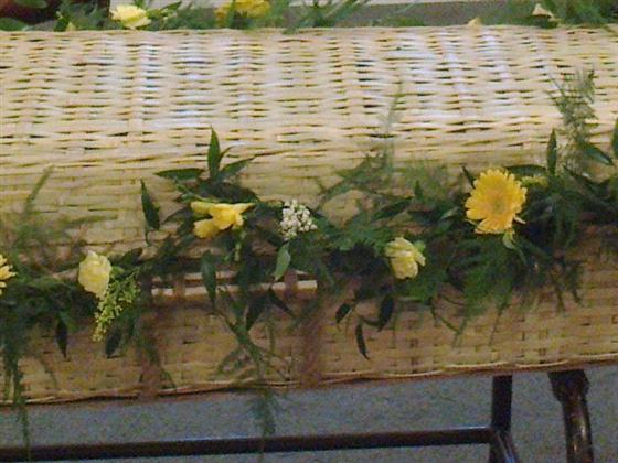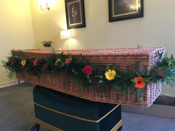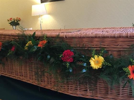 A coffin garland consisting of yellow & orange gerbera, red carnations, solidaster, french ruscus & buttonhole fern.
