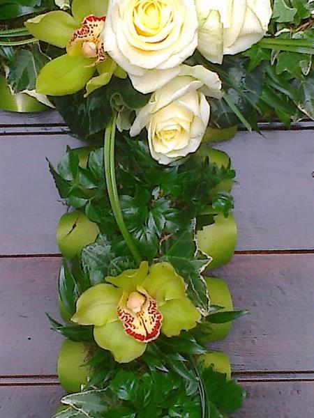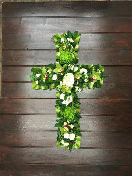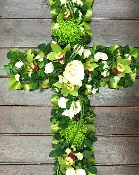 A 2ft modern green & white cross including green mini cymbidium orchids, white roses and mixed foliages with a green ribbon edge.