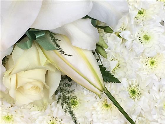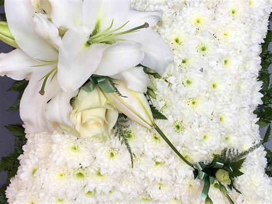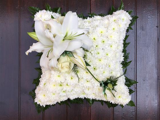 A 13" white chrysanthemum based cushion with white sprays and a foliage edge. Other sizes and colours are available.