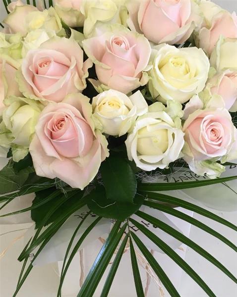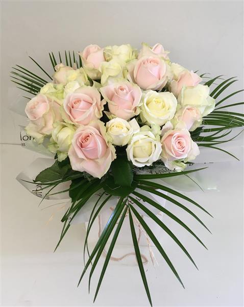 A gorgeous arrangement of 24 soft pink and white roses displayed as a hand tied aqua in a cream bag.