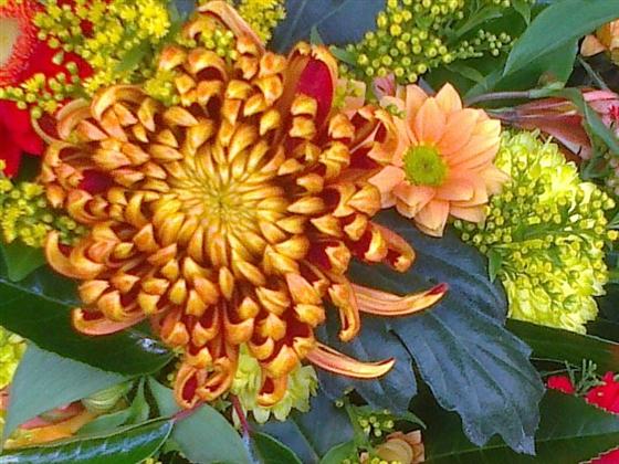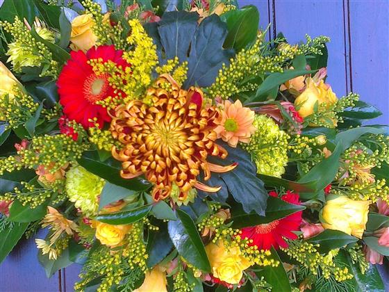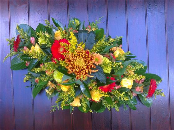 A 2ft double-ended spray, with a rustic autumnal selection of red, yellow and orange flowers with some complimenting foliages.