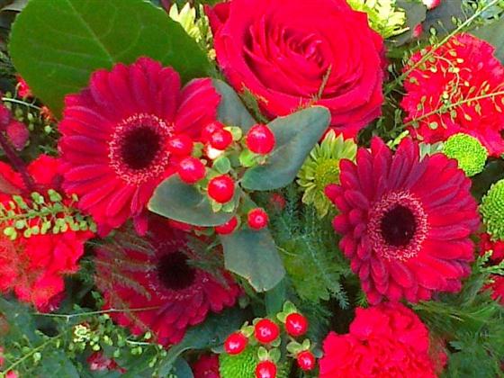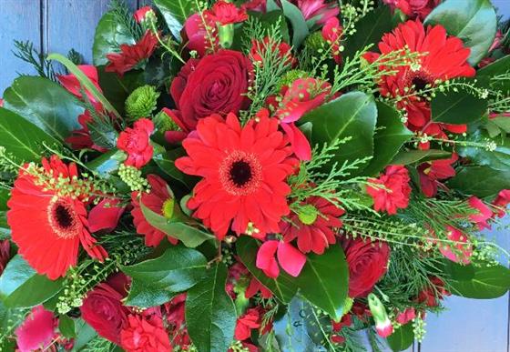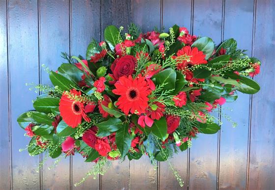 2ft All red & green flowers as a double ended spray in oasis with a mixture of foliages.
