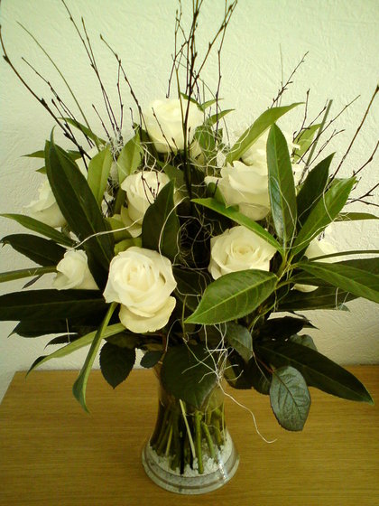 A beautiful arrangement of 12 white roses, twigs,& mixed foliages, delivered in a glass vase of our choice.
