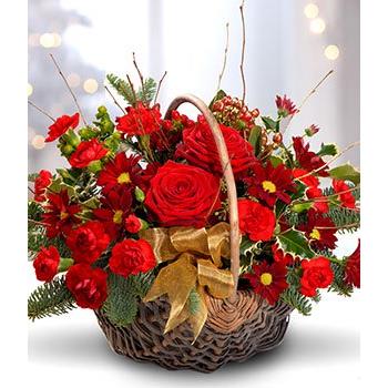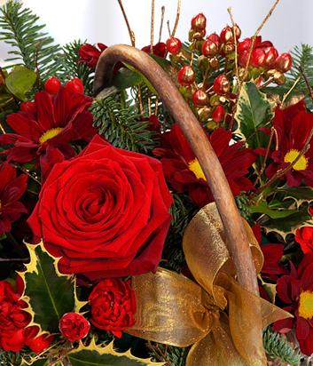 A lovely festive basket of red, green and gold flowers and some festive foliages. A perfect christmas gift for someone or just a little treat for yourself!
