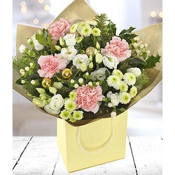 A lovely handtied aqua of pastel flowers and complimenting foliages delivered in a gift bag.
