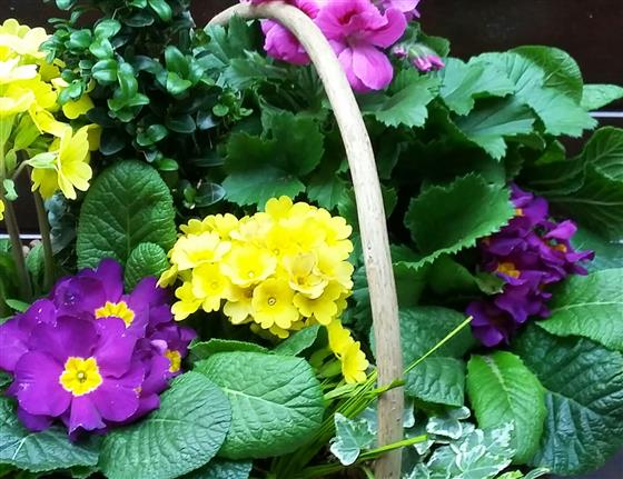 A living funeral basket with a selection of mixed plants.