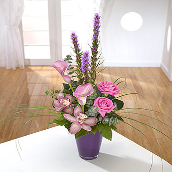 A stunning modern arrangement with a selection of mixed pink and purple flowers.