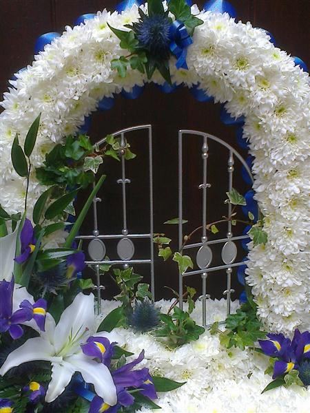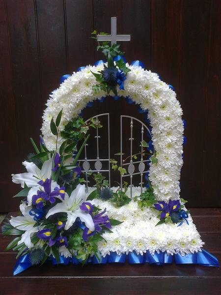 Gates of heaven, with a white chrysanthemum base, blue ribbon edge and a white and blue flower spray.