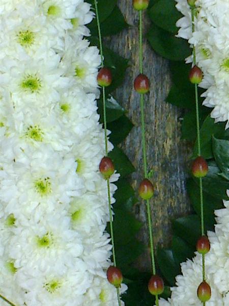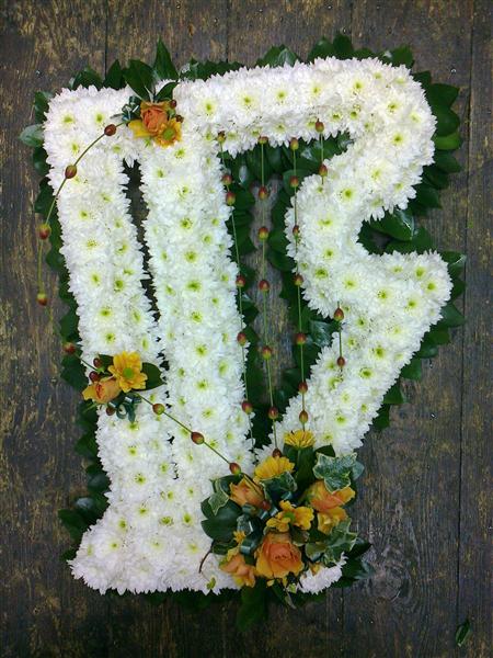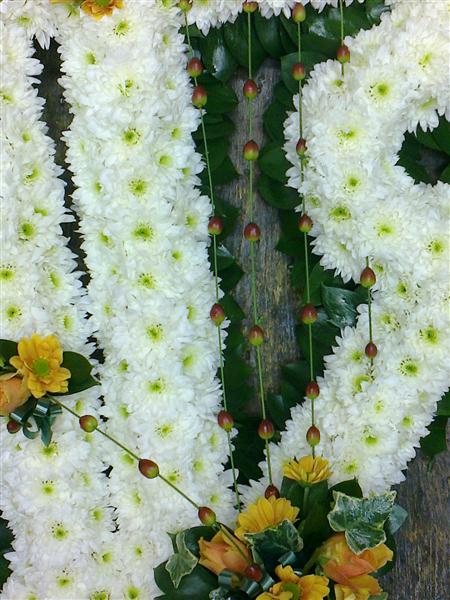 Harp funeral tribute based with white chrysanthemums, with a foliage edge and a orange Spray.