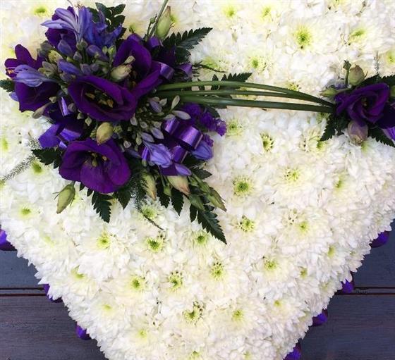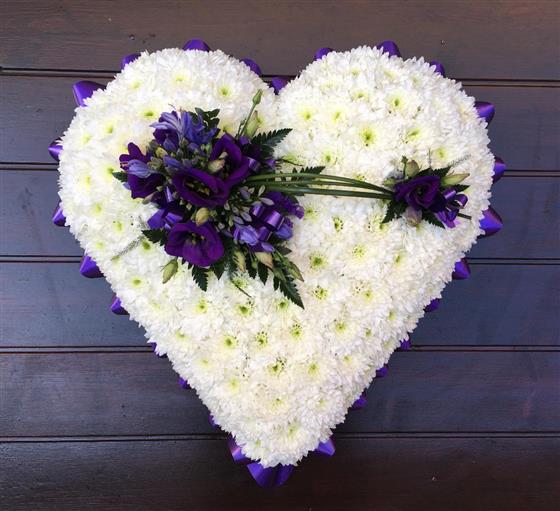 9" based heart with a purple ribbon edge, white base and purple sprays. Please note spray and ribbon edge colours can be changed.