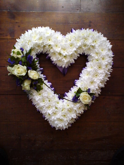 15" Open heart with white chrysanthemum base, blue ribbon and a white and blue spray.