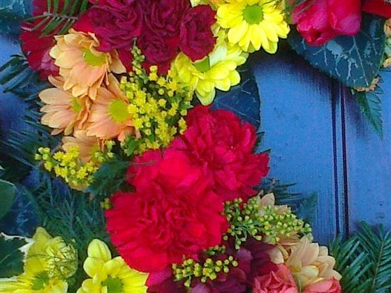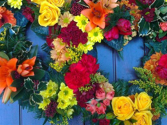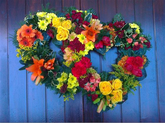 Double heart textured, with a lovely modern selection of yellow, orange and red flowers, with a mixed selection of foliages. Other colours are available.