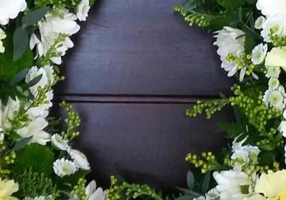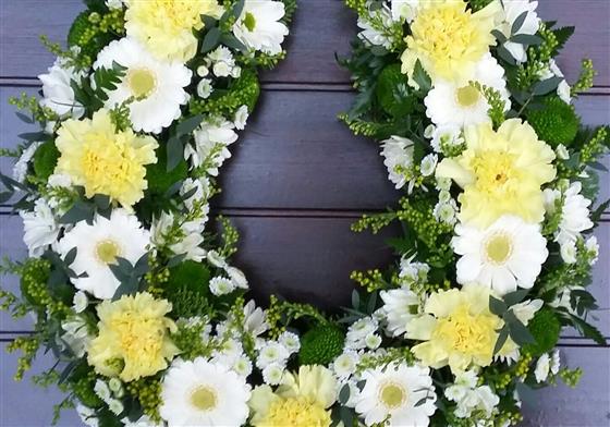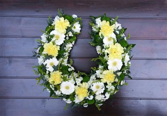 Horseshoe tribute in a mixture of yellow, cream and white flowers, and mixed foliages. Size 13" x 12.5"