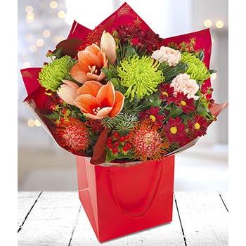 A lovely Handtie of mixed flowers including an Amaryllis and some foliages delivered in a gift bag.