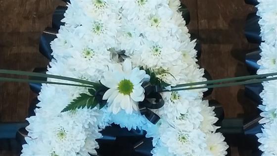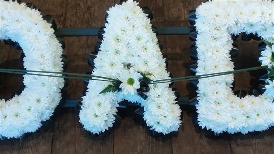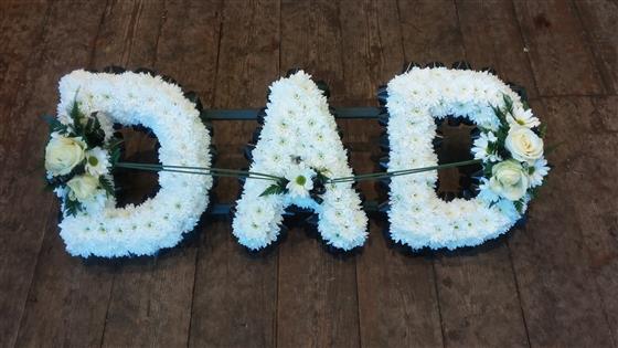 Dad letters with white chrysanthemum base, black ribbon edge, and white rose sprays. Frame size 11" x 33" .