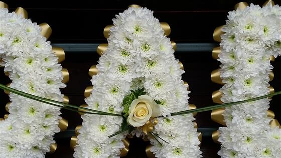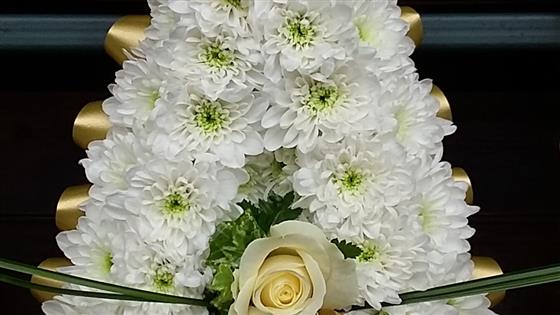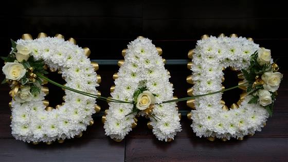 Dad letters with white chrysanthemum base, gold ribbon edge and gold and ivory sprays. Frame size 11" x 33".