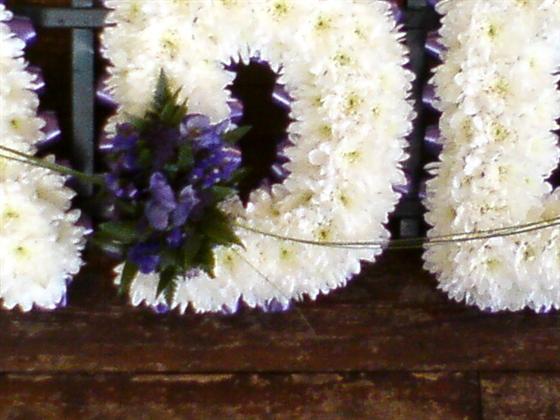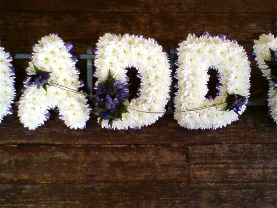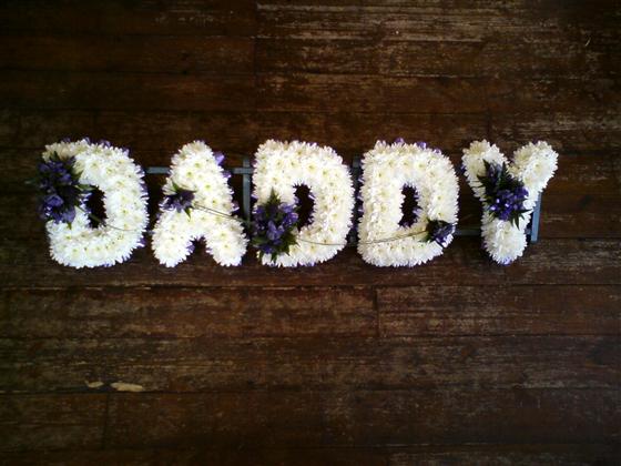 Daddy letters, with a white chrysanthemum base, blue sprays & blue ribbon edge.