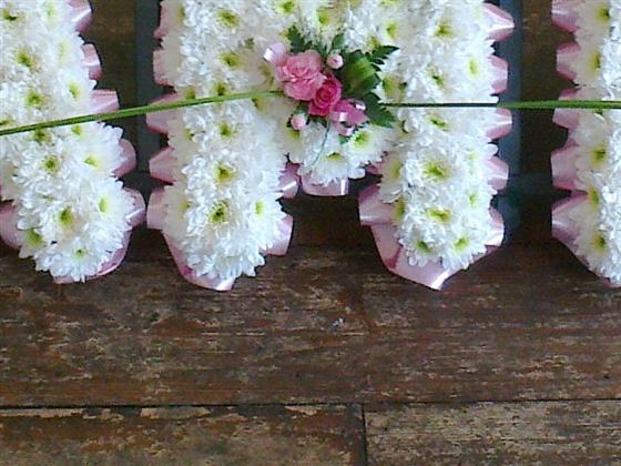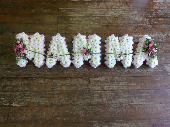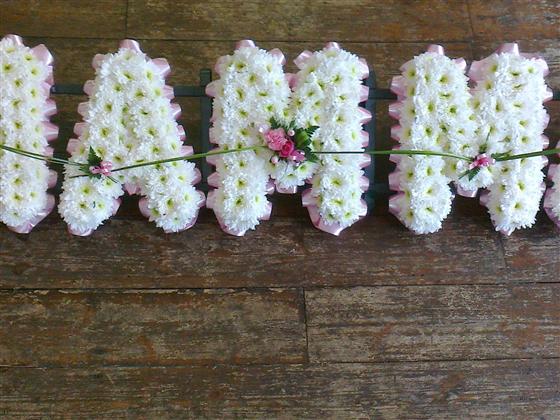 Mamma letters with a white chrysanthemum base, pink ribbon and sprays. Available in various colours. Frame size 11" x 33".