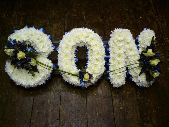 Son letters with white chyrsanthemum base, blue ribbon, and blue & white spray. Available in a selection of colours. Frame size 11" x 33".