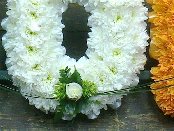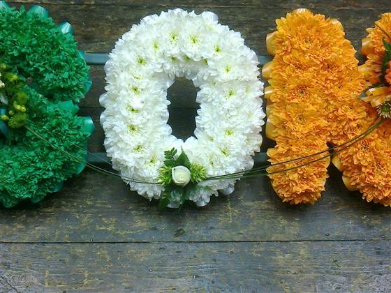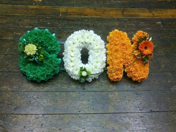 Son letters, based in chrysanthemums with matching colour sprays in the irish flag colours. Frame size 11" x 33". Other colours are available, please call us.