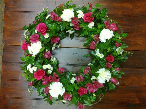 A 10" modern wreath with a lovely selection of mixed foliages and a sprinkling of cerise pink & white flowers including roses.