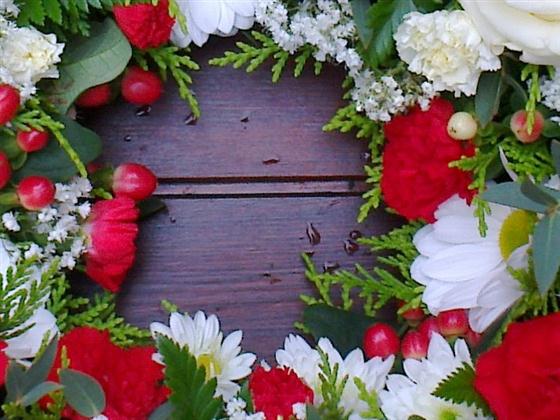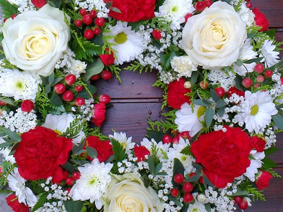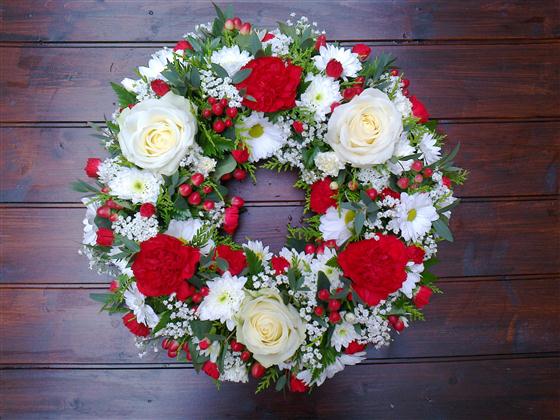 10 inch loose wreath with a nice mixture of foliages and red and white flowers.