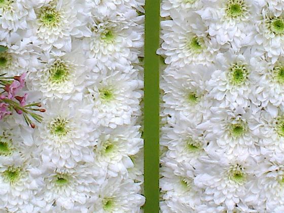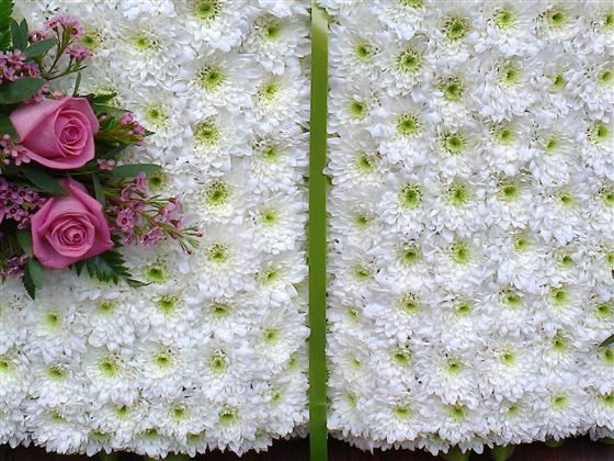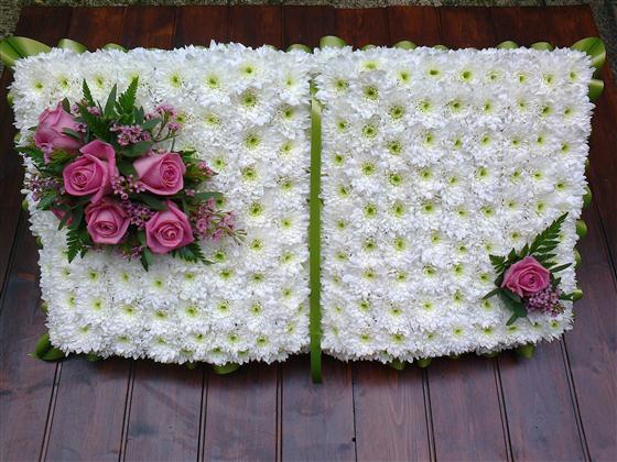 Open book based with white chrysanthemums, with a pink rose spray and ribbon edge. Various colours available. Size 25" wide x 14" high.