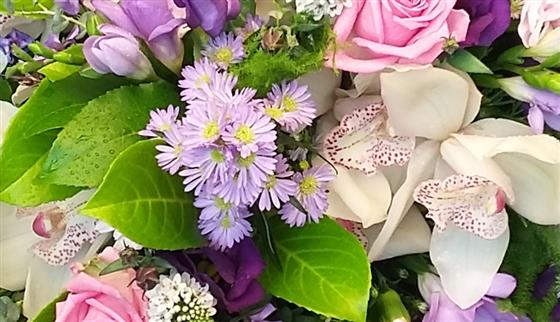 A beautiful pink, lilac and white 2ft double ended spray inlcuding cymbidium orchids, freesias, roses and other mixed flowers.