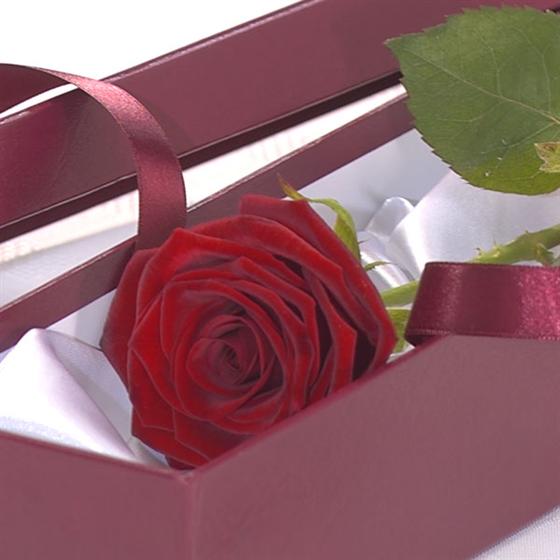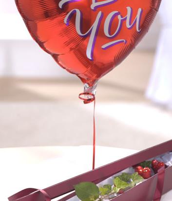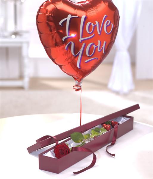 A traditional expression of love. A single red Rose in an exquisite box with an 'I Love You' balloon.