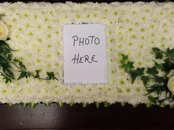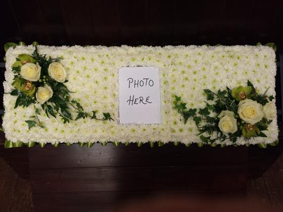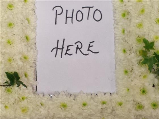 Large Picture Frame with a white chrysanthemum base, green ribbon edge with green and white sprays. Any picture can be incorporated within. Size 36 x 12.