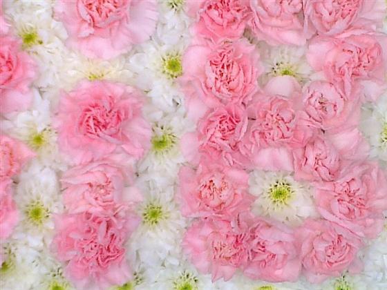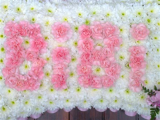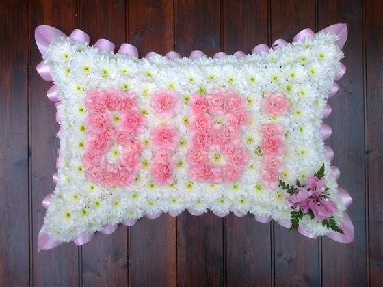 20 x 13 Based pillow with a white chrysanthemum base, pink ribbon edge, pink spray and BiBi letters in pink spray carnations.