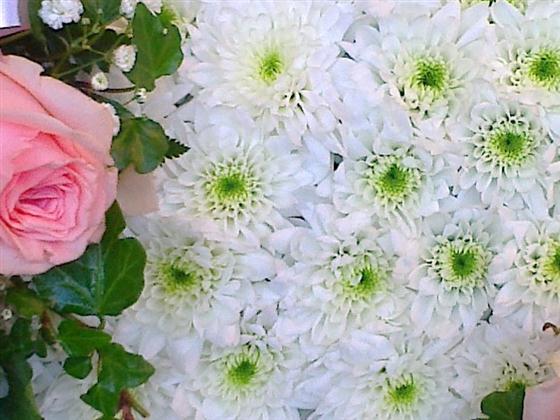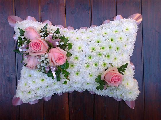 13" pillow with a light pink ribbon edge, pink sprays and a white chrysanthemum base. 13" = 10x15" 15" = 12x18" 17"= 13x20"