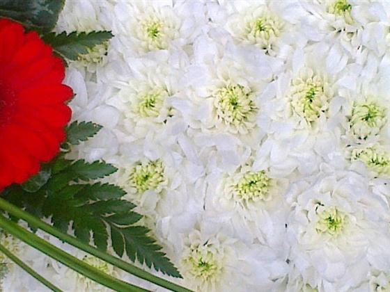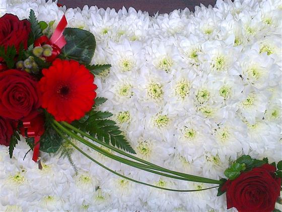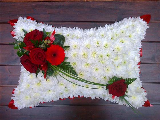 13" pillow with a red ribbon edge, red rose sprays on a white chrysanthemum base. 13" = 10x15" 15" = 12x18" 17"= 13x20" 21" = 14x21"