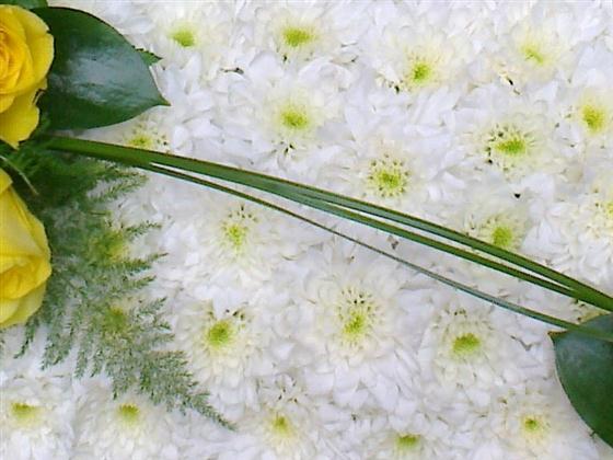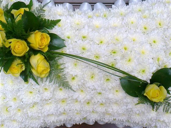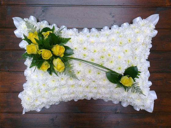 13" pillow with a yellow spray, white ribbon edge and a white chrysanthemum base. 13" = 10x15" 15" = 12x18", 17" = 13x20" 21" = 14x21"