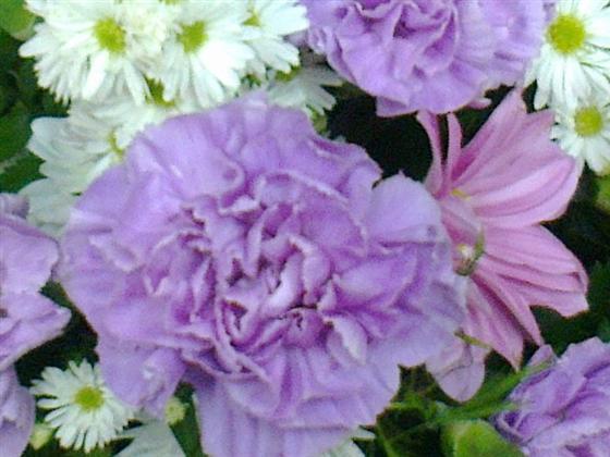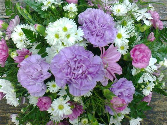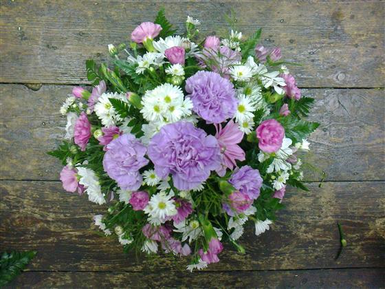 A beautiful funeral posy with a mixed selection of pink, white and lilac flowers and some foliages. Approx size 9"
