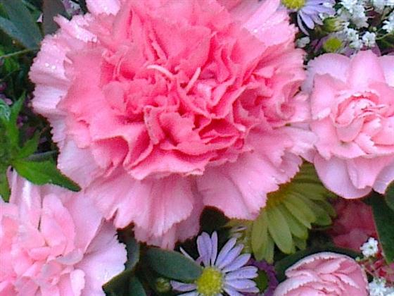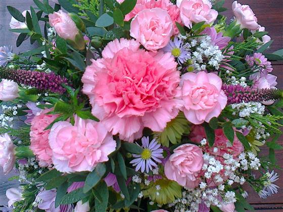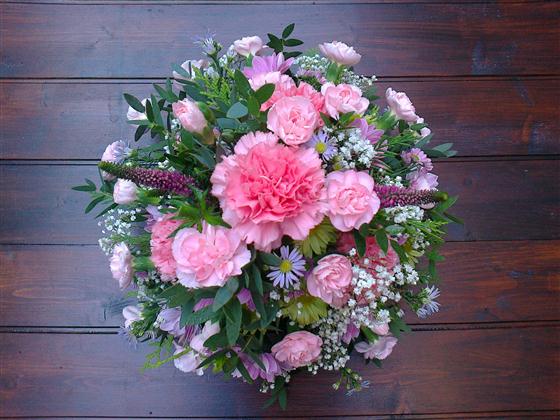 A mixed selection of pink white and lilac flowers with some foliages as a funeral posy. Approx size 9"