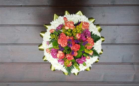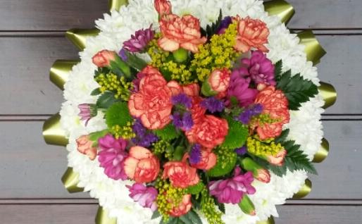 A vibrant based 10" posy of white chrysanthemums, vibrant mixed spray and green ribbon.