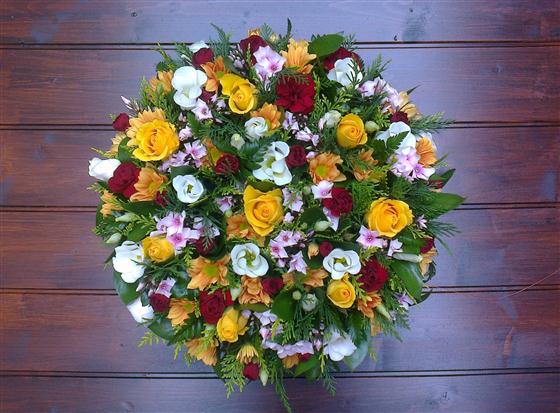 10" Posy pad with a mixed selection of white, yellow, orange, pink and red flowers.