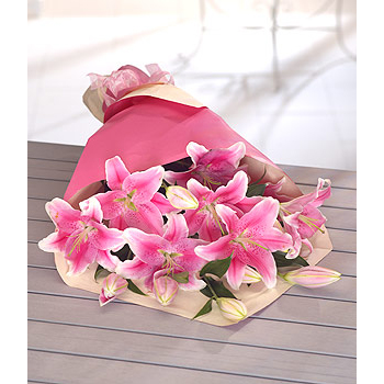 A beautifully presented fragrant wrap of pink lillies. Simply stunning.